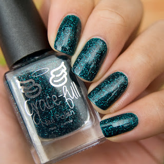 Evergreen Envy - described as "a jelly teal coloured base with a smattering of holo flakes". 2 coats of this deep pine green jelly filled with silver holo flakies. Formula is smooth and easy as per usual, easy to apply and has a deep glow IRL that doesn't translate to camera. Does stain slightly so use a base coat.